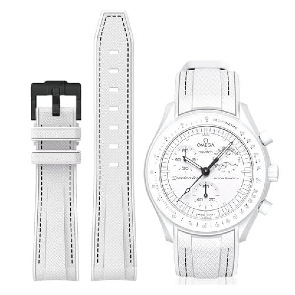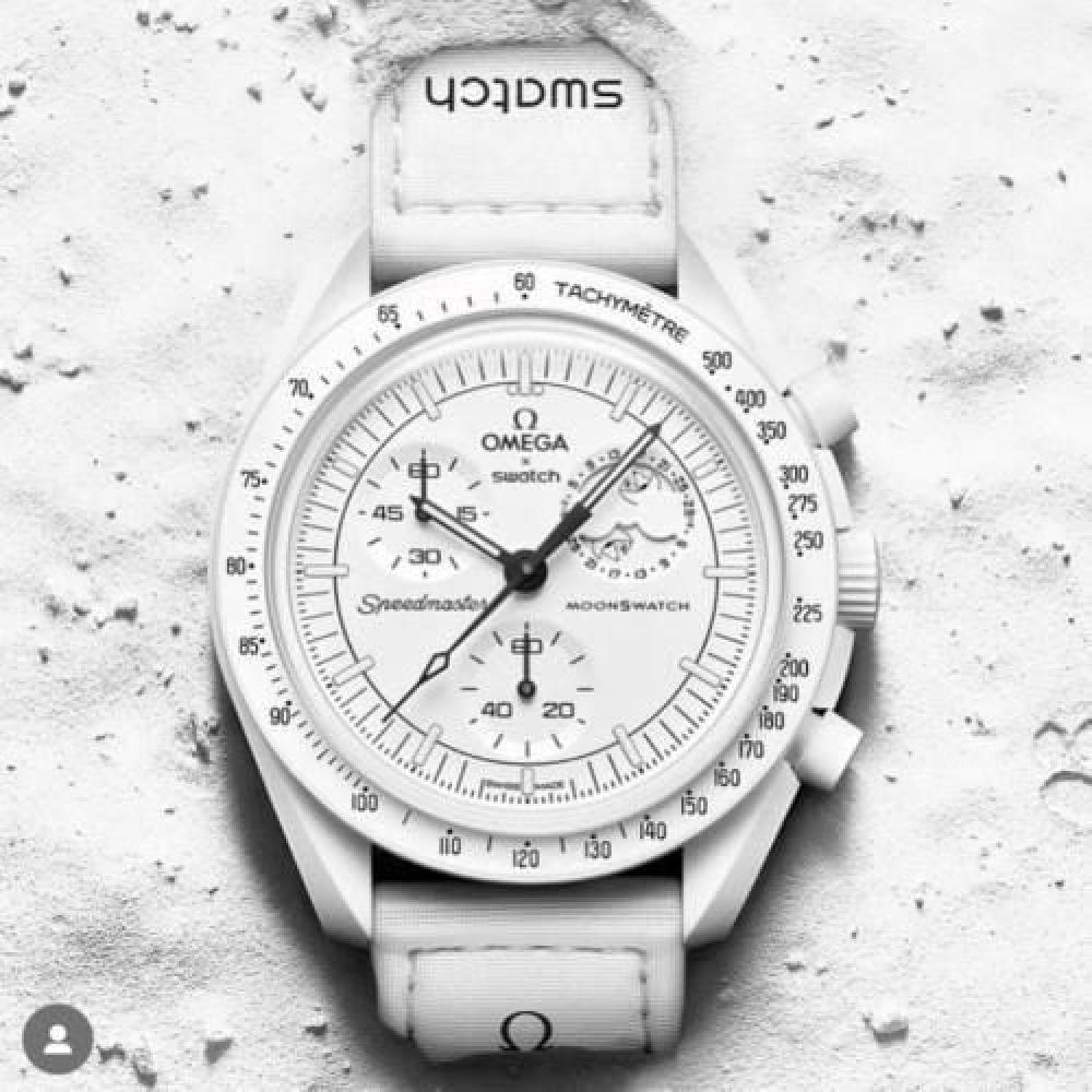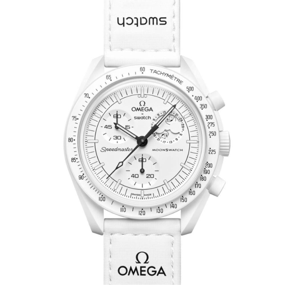 • السوار: قماش (NATO) أبيض بنقش شعار Swatch وأوميغا